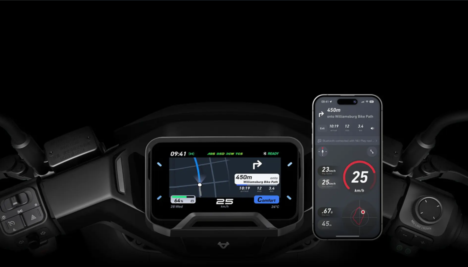 Prends le contrôle avec le NIU Link Crown : avec son écran couleur de 5” il te donne accès, du bout du pouce, à la navigation, à ta musique, à tes appels et à tes modes de conduite personnalisés. Profite des diagnostics intelligents, du chronomètre de tours, du suivi d’itinéraire et des mises à jour OTA pour que ton scooter évolue en même temps que toi.
